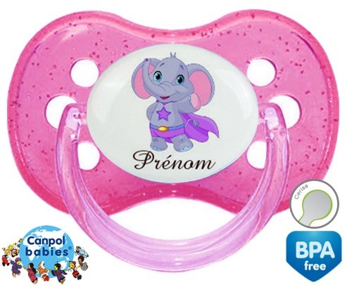 Sucette personnalisée pour bébé Elephant super héros + prénom à embout Cerise en silicone de la marque Canpol Babies avec impression en en Couleurs de la collection Prénom personnalisé.La silicone se reconnaît par sa couleur transparente. C'est une matière souple, douce, sans goût ni odeur et offre à bébé une succion plus facile grâce à sa souplesse.