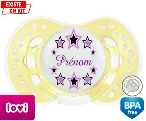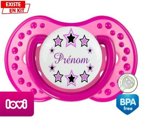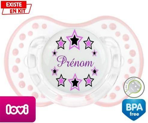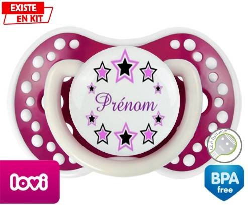 Sucette personnalisée pour bébé Étoile modèle (fille) + prénom à embout LOVI Dynamic en silicone de la marque Lovi Dynamic avec impression en en Couleurs de la collection Prénom personnalisé.La silicone se reconnaît par sa couleur transparente. C'est une matière souple, douce, sans goût ni odeur et offre à bébé une succion plus facile grâce à sa souplesse.