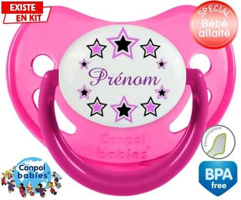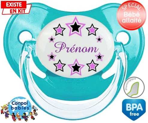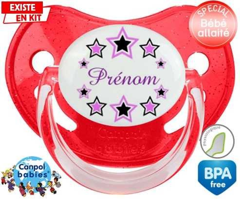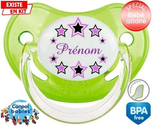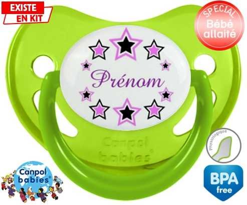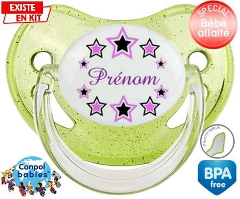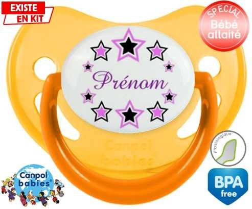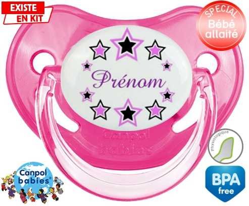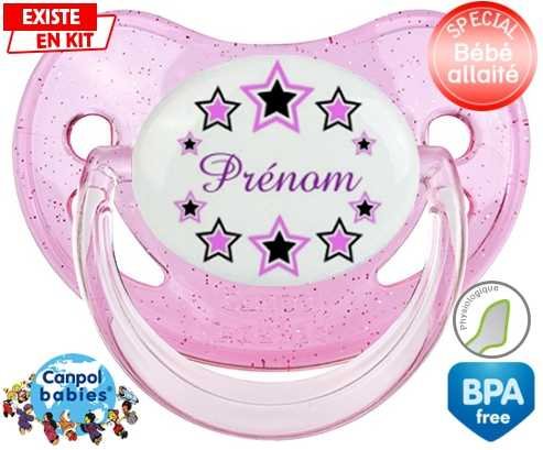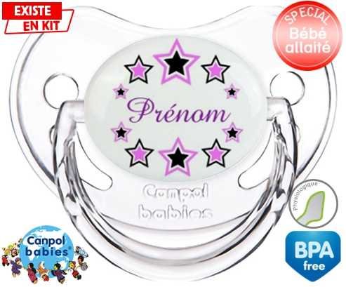 Sucette personnalisée pour bébé Étoile modèle (fille) + prénom à embout Physiologique en silicone de la marque Canpol Babies avec impression en en Couleurs de la collection Prénom personnalisé.La silicone se reconnaît par sa couleur transparente. C'est une matière souple, douce, sans goût ni odeur et offre à bébé une succion plus facile grâce à sa souplesse.