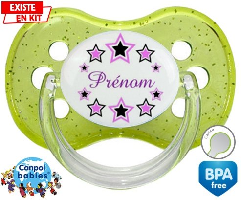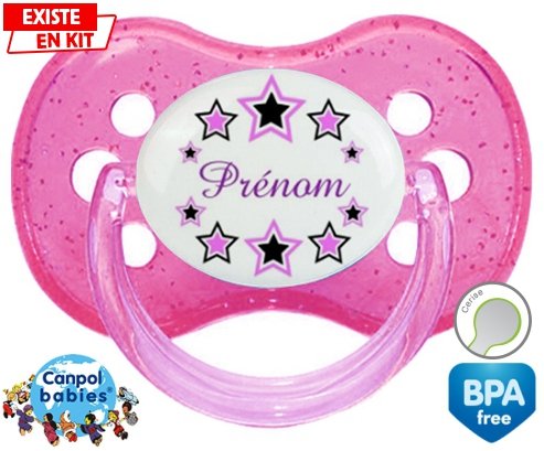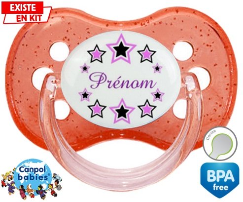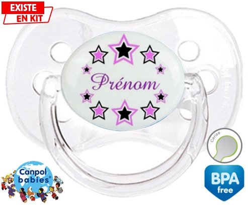 Tétine personnalisée pour bébé Étoile modèle (fille) + prénom à embout Cerise en silicone de la marque Canpol Babies avec impression en en Couleurs de la collection Prénom personnalisé.La silicone se reconnaît par sa couleur transparente. C'est une matière souple, douce, sans goût ni odeur et offre à bébé une succion plus facile grâce à sa souplesse.