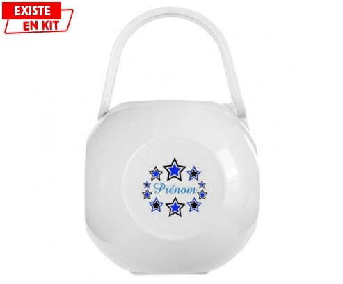 Boîte à sucette personnalisée : Étoile modèle (garçon) + prénom , avec une impression en couleur et qui compléte toute la gamme ( sucette, attache-sucette, bavoir, chausson, body et bonnet).