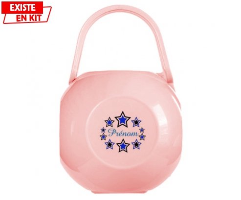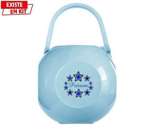 Boîte à sucette avec design : Étoile modèle (garçon) + prénom , impression de qualité et en couleur. Pratique : elle transporte la sucette en tout lieu. Grâce à sa poignée souple, elle est facile à accrocher à la poussette, sac à langer ... Cette boîte de rangement flexible, est la solution hygiénique pour protéger les sucettes de son enfant quand il ne les utilise pas. Peut contenir jusqu'à deux sucettes.