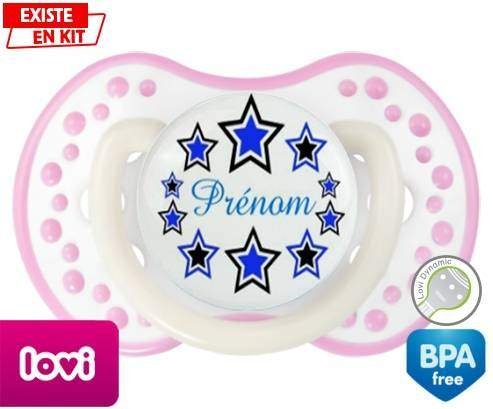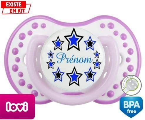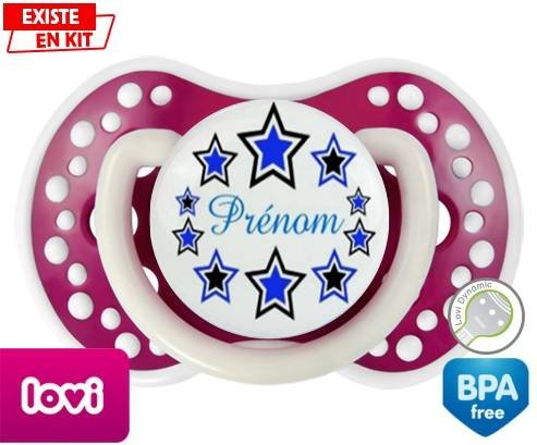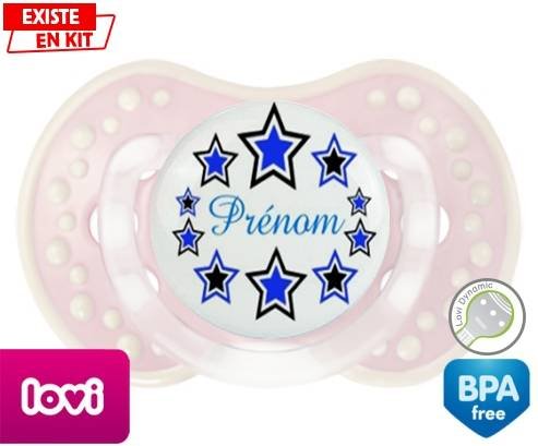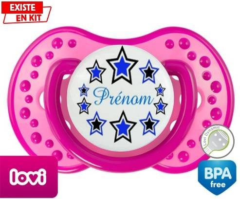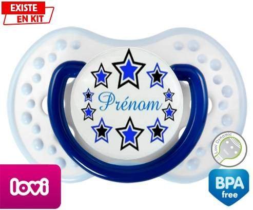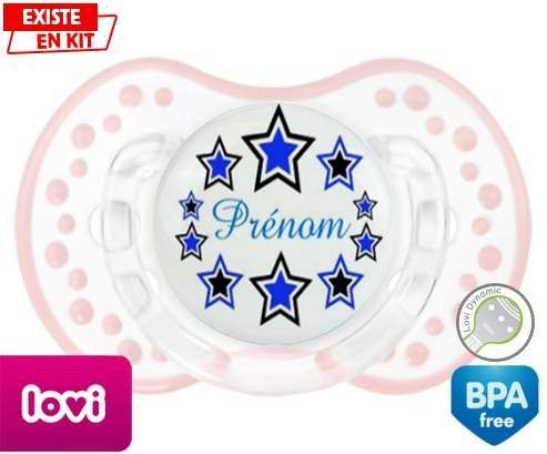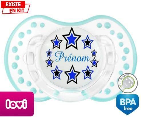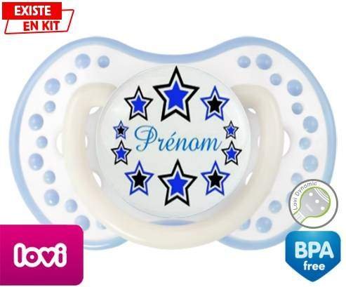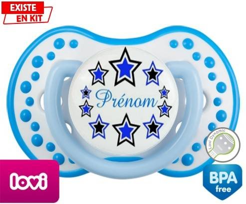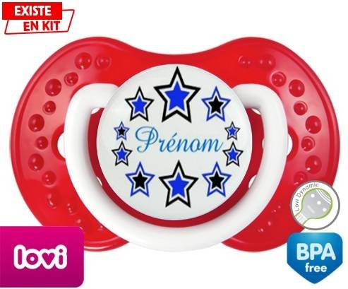 Tétine personnalisée pour bébé Étoile modèle (garçon) + prénom à embout LOVI Dynamic en silicone de la marque Lovi Dynamic avec impression en en Couleurs de la collection Prénom personnalisé.La silicone se reconnaît par sa couleur transparente. C'est une matière souple, douce, sans goût ni odeur et offre à bébé une succion plus facile grâce à sa souplesse.