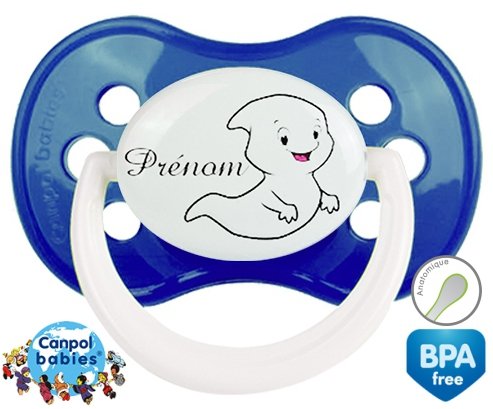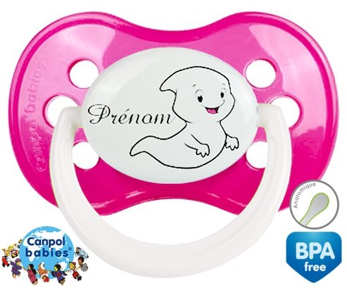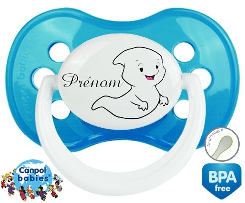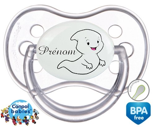 Sucette personnalisée pour bébé Fantôme + prénom à embout Anatomique en silicone de la marque Canpol Babies avec impression en en Couleurs de la collection Prénom personnalisé.La silicone se reconnaît par sa couleur transparente. C'est une matière souple, douce, sans goût ni odeur et offre à bébé une succion plus facile grâce à sa souplesse.