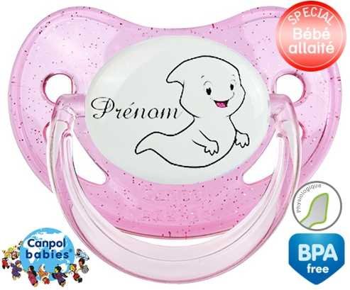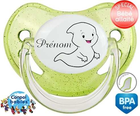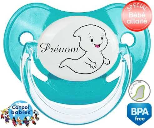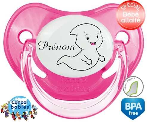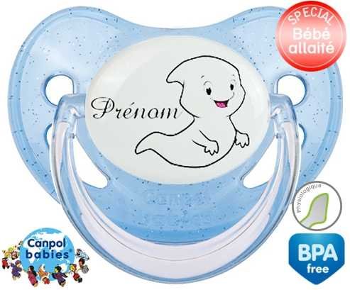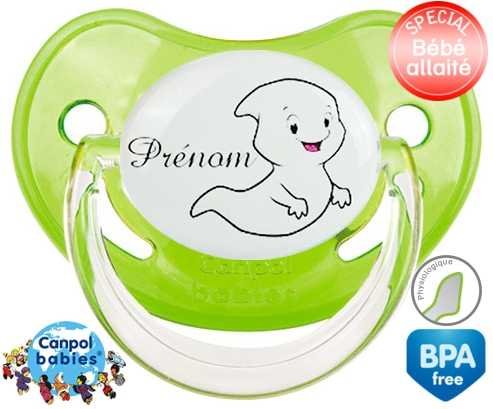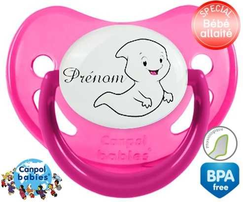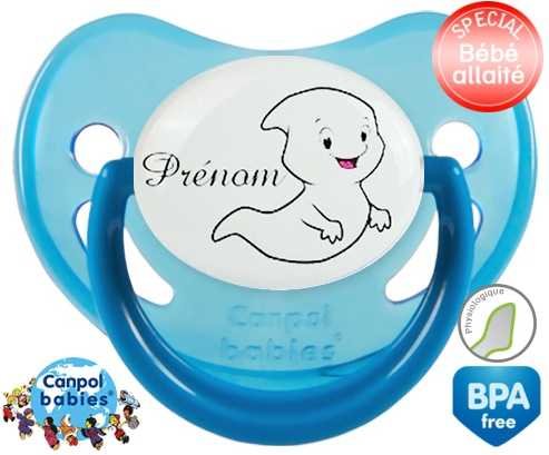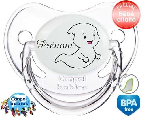 Tétine personnalisée pour bébé Fantôme + prénom à embout Physiologique en silicone de la marque Canpol Babies avec impression en en Couleurs de la collection Prénom personnalisé.La silicone se reconnaît par sa couleur transparente. C'est une matière souple, douce, sans goût ni odeur et offre à bébé une succion plus facile grâce à sa souplesse.