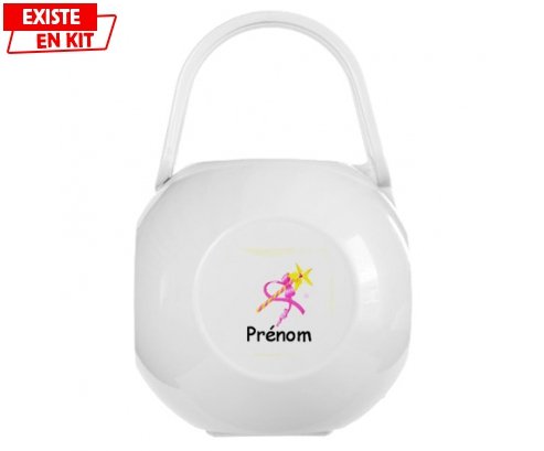 Boîte à sucette personnalisée : Fée baguette + prénom , avec une impression en couleur et qui compléte toute la gamme ( sucette, attache-sucette, bavoir, chausson, body et bonnet).