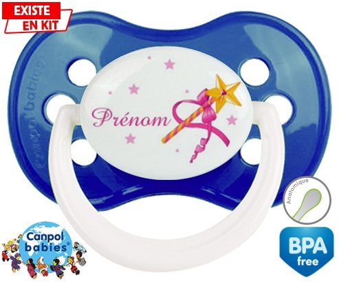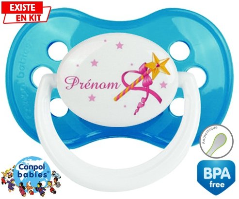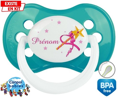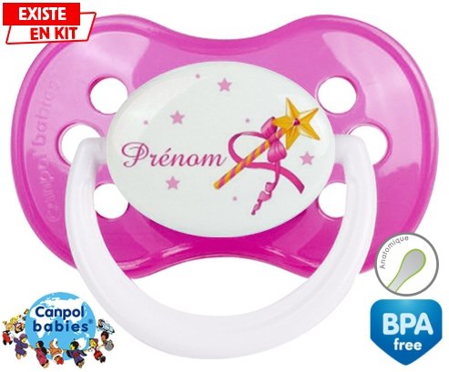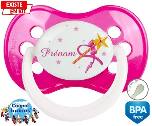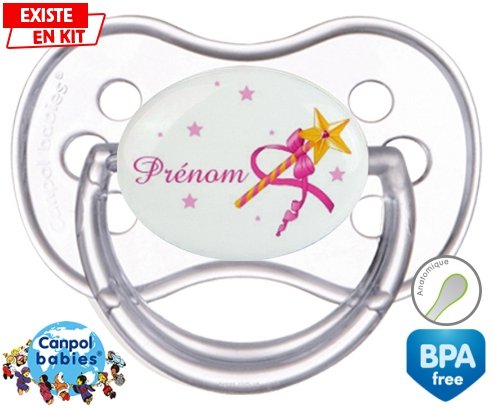 Sucette personnalisée pour bébé Fée baguette + prénom à embout Anatomique en silicone de la marque Canpol Babies avec impression en en Couleurs de la collection Prénom personnalisé.La silicone se reconnaît par sa couleur transparente. C'est une matière souple, douce, sans goût ni odeur et offre à bébé une succion plus facile grâce à sa souplesse.