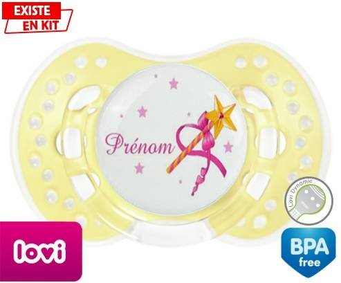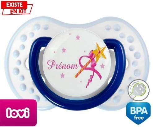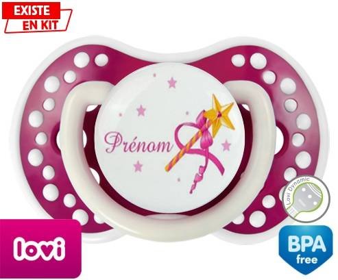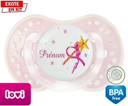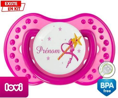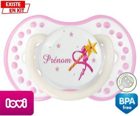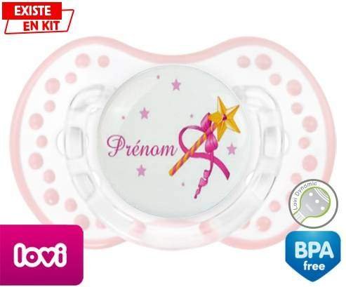 Tétine personnalisée pour bébé Fée baguette + prénom à embout LOVI Dynamic en silicone de la marque Lovi Dynamic avec impression en en Couleurs de la collection Prénom personnalisé.La silicone se reconnaît par sa couleur transparente. C'est une matière souple, douce, sans goût ni odeur et offre à bébé une succion plus facile grâce à sa souplesse.
