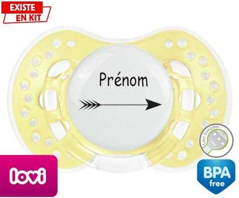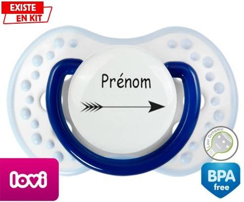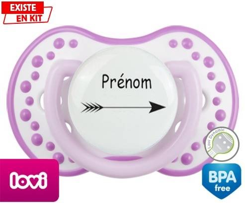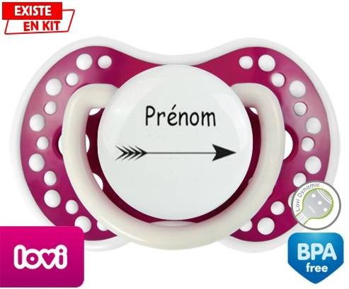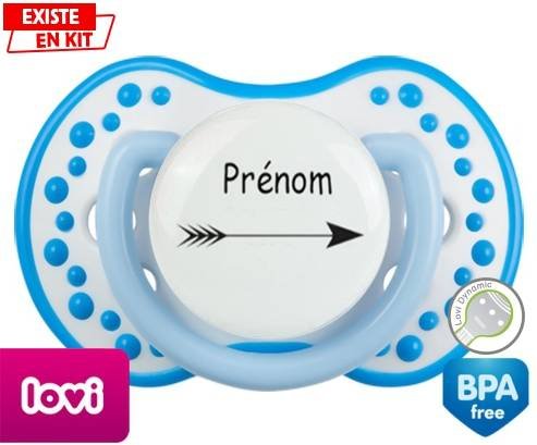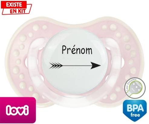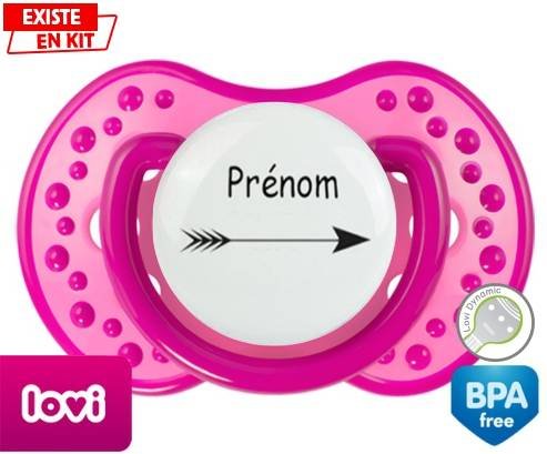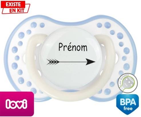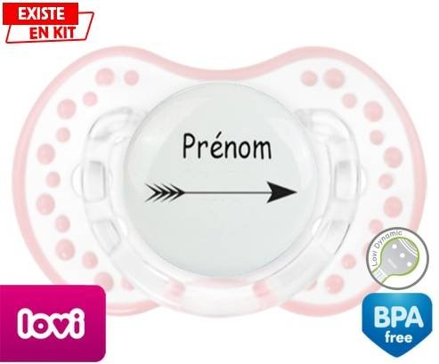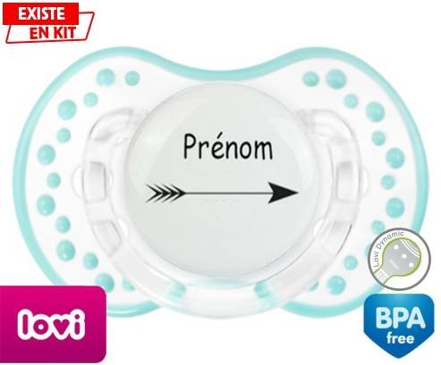 Tetine personnalisee pour bébé Flèche + prénom à embout LOVI Dynamic en silicone de la marque Lovi Dynamic avec impression en en Couleurs de la collection Prénom personnalisé.La silicone se reconnaît par sa couleur transparente. C'est une matière souple, douce, sans goût ni odeur et offre à bébé une succion plus facile grâce à sa souplesse.