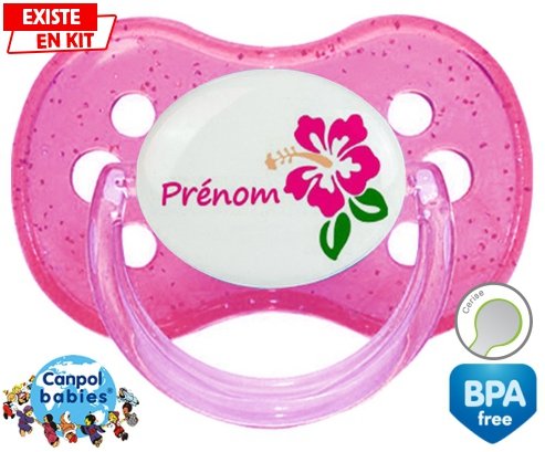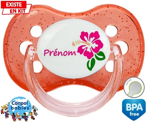 Sucette personnalisée pour bébé Fleur guadeloupe + prénom à embout Cerise en silicone de la marque Canpol Babies avec impression en en Couleurs de la collection Prénom personnalisé.La silicone se reconnaît par sa couleur transparente. C'est une matière souple, douce, sans goût ni odeur et offre à bébé une succion plus facile grâce à sa souplesse.