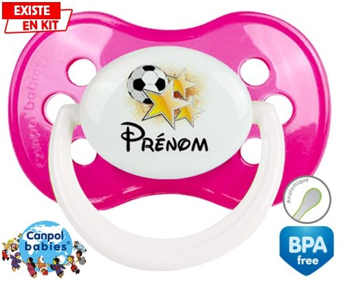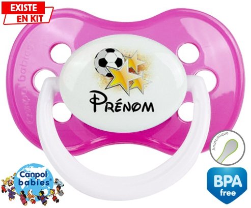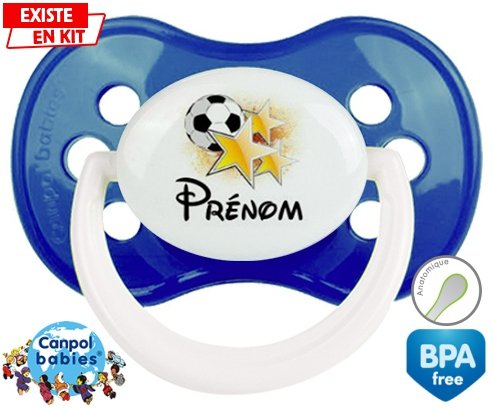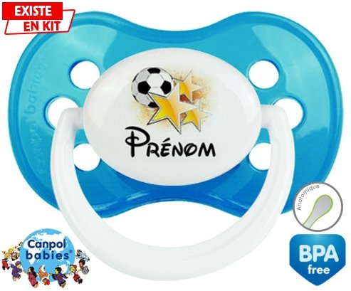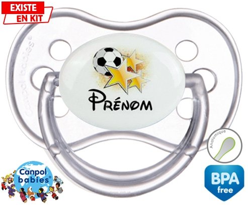 Tétine personnalisée pour bébé Foot étoile + prénom à embout Anatomique en silicone de la marque Canpol Babies avec impression en en Couleurs de la collection Prénom personnalisé.La silicone se reconnaît par sa couleur transparente. C'est une matière souple, douce, sans goût ni odeur et offre à bébé une succion plus facile grâce à sa souplesse.
