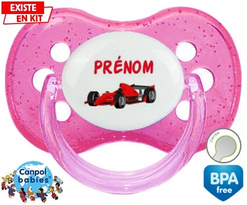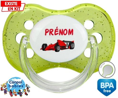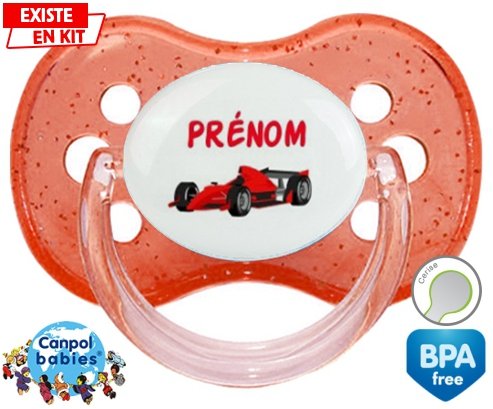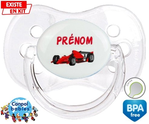 Tetine personnalisee pour bébé Formule 1 + prénom à embout Cerise en silicone de la marque Canpol Babies avec impression en en Couleurs de la collection Prénom personnalisé.La silicone se reconnaît par sa couleur transparente. C'est une matière souple, douce, sans goût ni odeur et offre à bébé une succion plus facile grâce à sa souplesse.