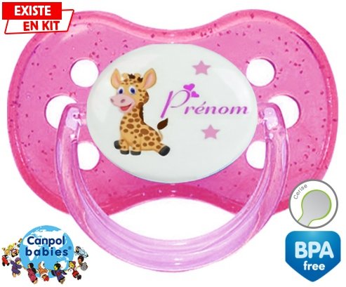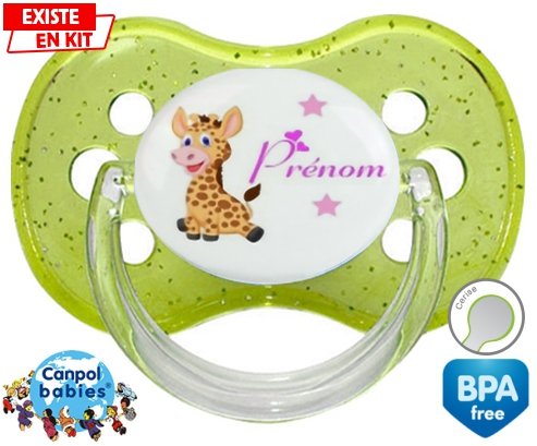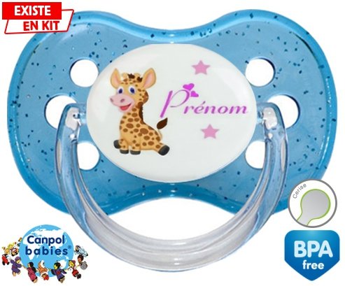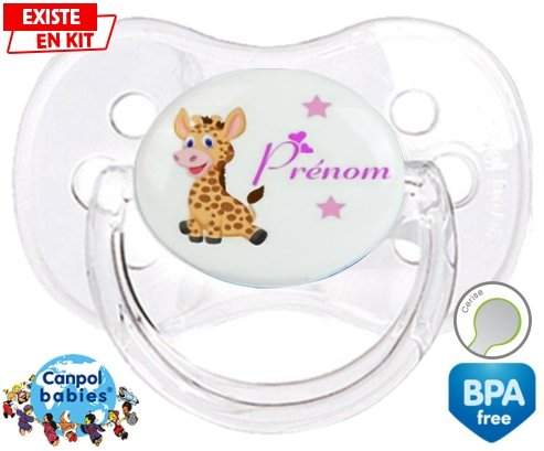 Tetine personnalisee pour bébé Girafe style1 + prénom à embout Cerise en silicone de la marque Canpol Babies avec impression en en Couleurs de la collection Prénom personnalisé.La silicone se reconnaît par sa couleur transparente. C'est une matière souple, douce, sans goût ni odeur et offre à bébé une succion plus facile grâce à sa souplesse.