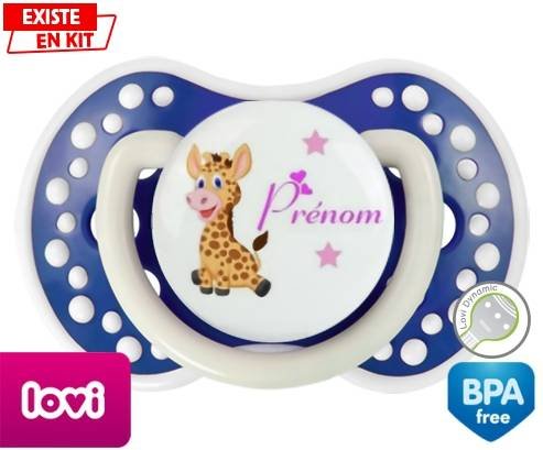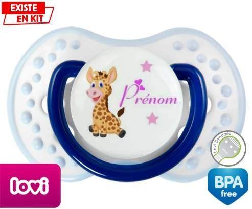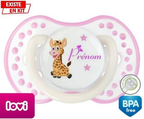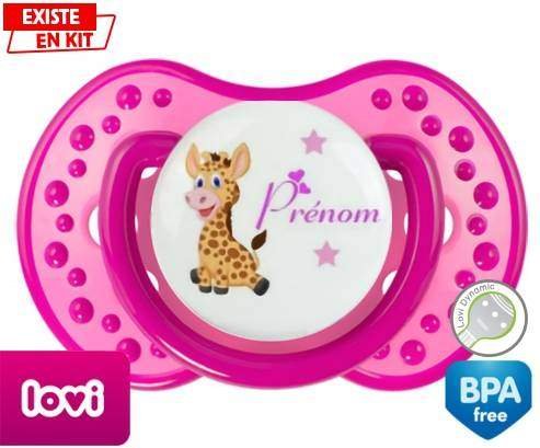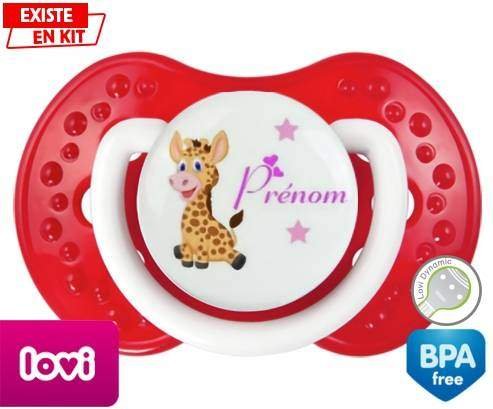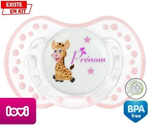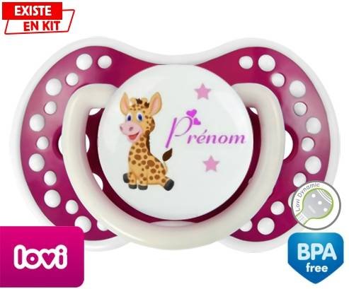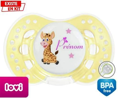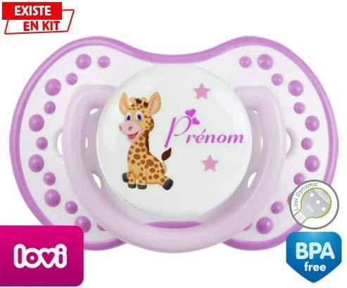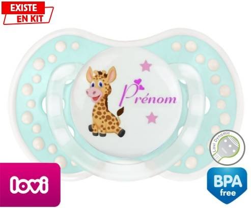 Sucette personnalisée pour bébé Girafe style1 + prénom à embout LOVI Dynamic en silicone de la marque Lovi Dynamic avec impression en en Couleurs de la collection Prénom personnalisé.La silicone se reconnaît par sa couleur transparente. C'est une matière souple, douce, sans goût ni odeur et offre à bébé une succion plus facile grâce à sa souplesse.
