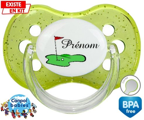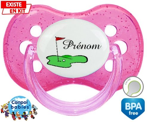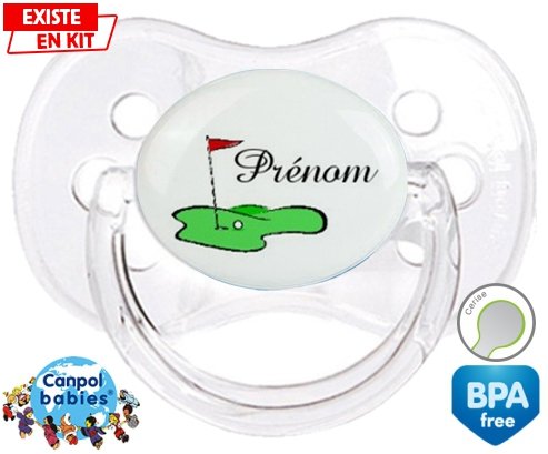 Tétine personnalisée pour bébé Golf + prénom à embout Cerise en silicone de la marque Canpol Babies avec impression en en Couleurs de la collection Prénom personnalisé.La silicone se reconnaît par sa couleur transparente. C'est une matière souple, douce, sans goût ni odeur et offre à bébé une succion plus facile grâce à sa souplesse.