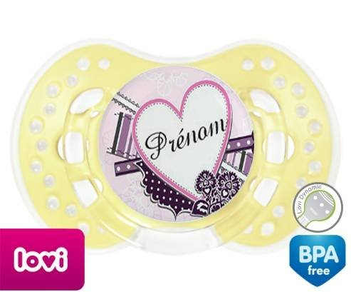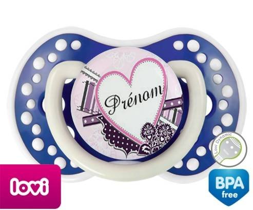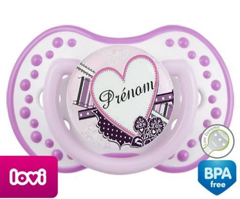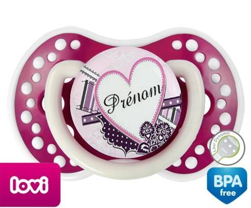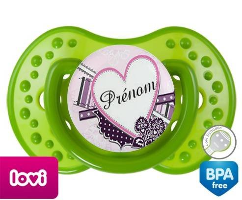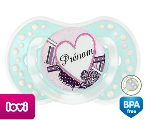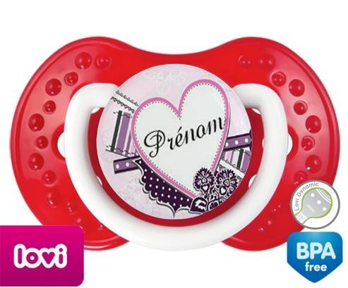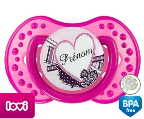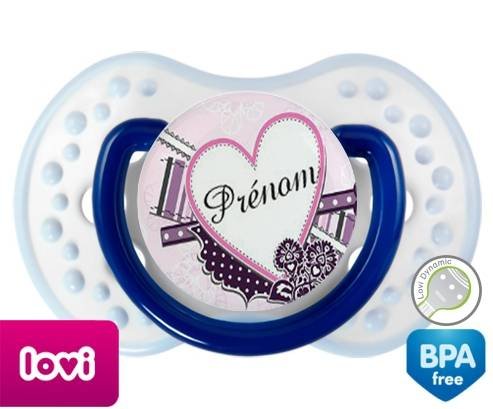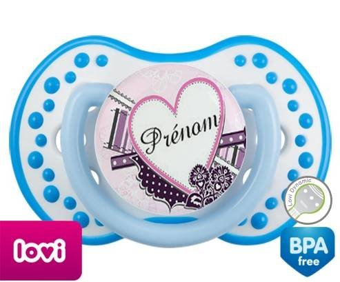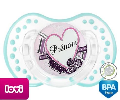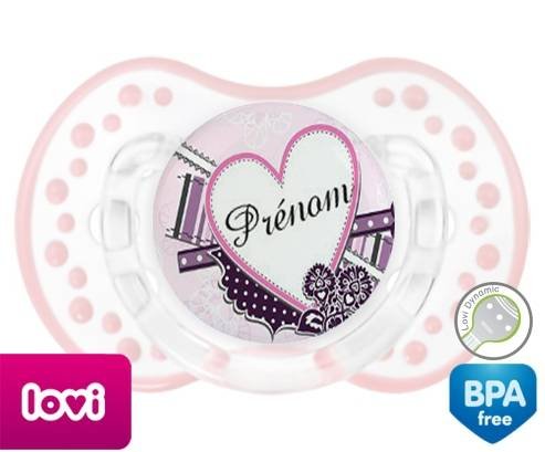 Sucette personnalisée pour bébé Graphisme cœurs turquie + prénom à embout LOVI Dynamic en silicone de la marque Lovi Dynamic avec impression en en Couleurs de la collection Prénom personnalisé.La silicone se reconnaît par sa couleur transparente. C'est une matière souple, douce, sans goût ni odeur et offre à bébé une succion plus facile grâce à sa souplesse.