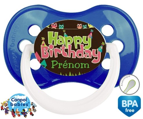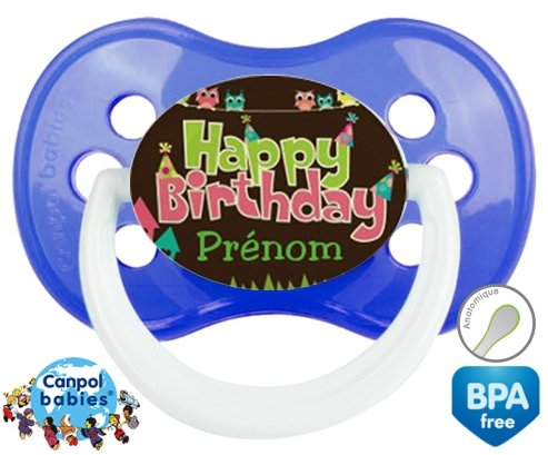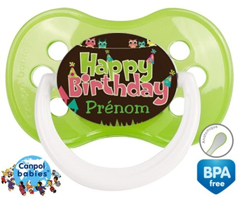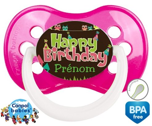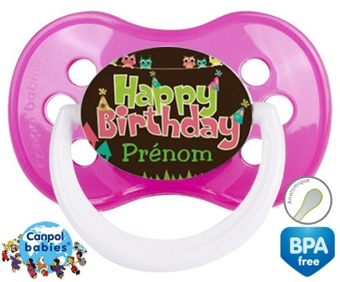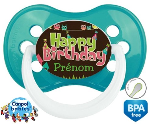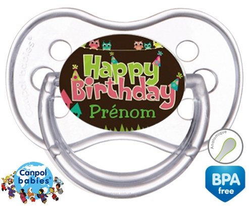 Tetine personnalisee pour bébé Happy birthday style3 + prénom à embout Anatomique en silicone de la marque Canpol Babies avec impression en en Couleurs de la collection Prénom personnalisé.La silicone se reconnaît par sa couleur transparente. C'est une matière souple, douce, sans goût ni odeur et offre à bébé une succion plus facile grâce à sa souplesse.