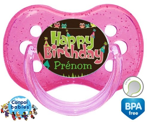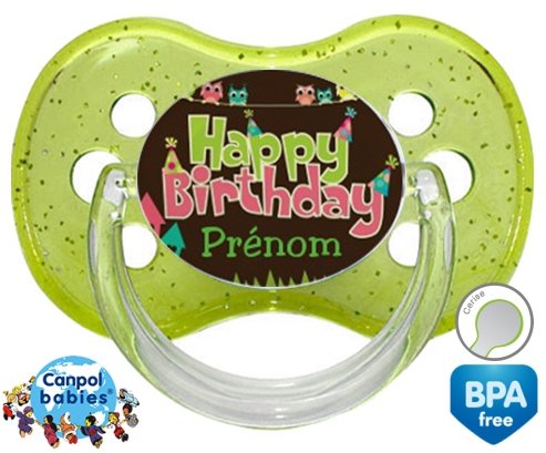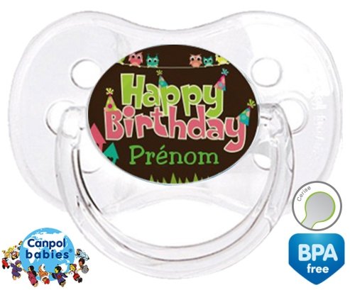 Sucette personnalisée pour bébé Happy birthday style3 + prénom à embout Cerise en silicone de la marque Canpol Babies avec impression en en Couleurs de la collection Prénom personnalisé.La silicone se reconnaît par sa couleur transparente. C'est une matière souple, douce, sans goût ni odeur et offre à bébé une succion plus facile grâce à sa souplesse.