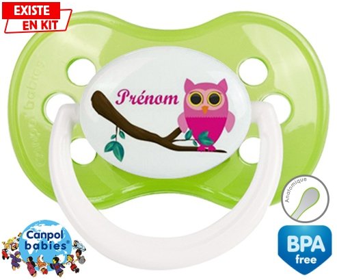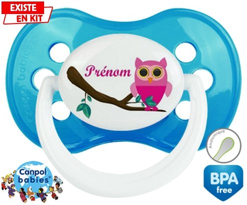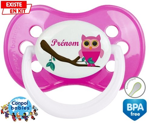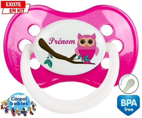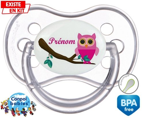 Tétine personnalisée pour bébé Hibou rose + prénom à embout Anatomique en silicone de la marque Canpol Babies avec impression en en Couleurs de la collection Prénom personnalisé.La silicone se reconnaît par sa couleur transparente. C'est une matière souple, douce, sans goût ni odeur et offre à bébé une succion plus facile grâce à sa souplesse.