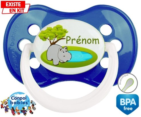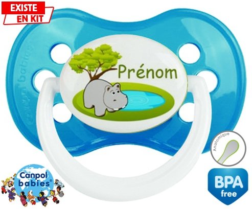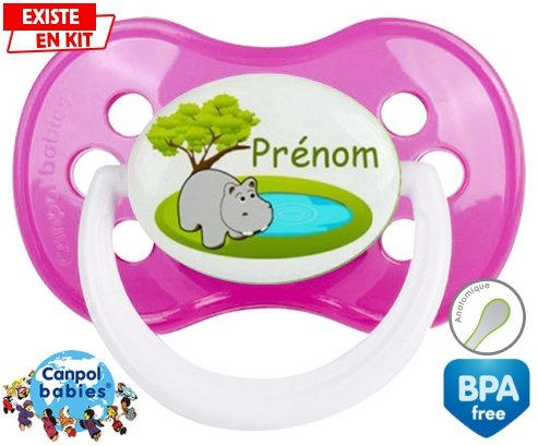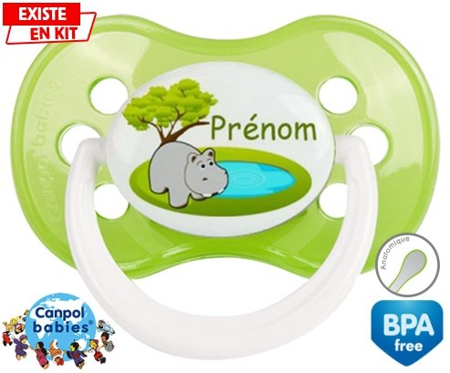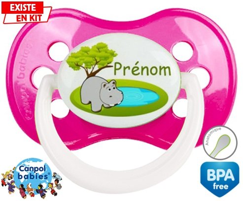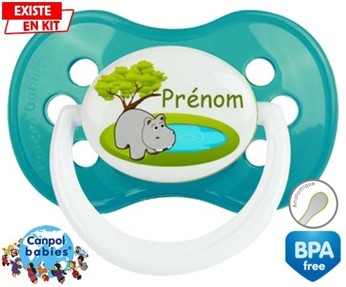 Sucette personnalisée pour bébé Hypopotame + prénom à embout Anatomique en silicone de la marque Canpol Babies avec impression en en Couleurs de la collection Prénom personnalisé.La silicone se reconnaît par sa couleur transparente. C'est une matière souple, douce, sans goût ni odeur et offre à bébé une succion plus facile grâce à sa souplesse.