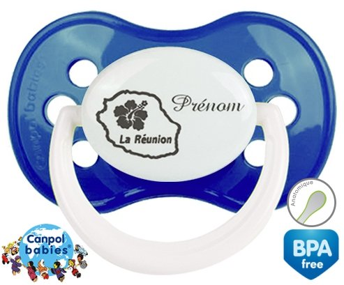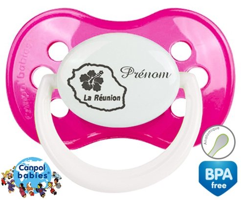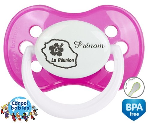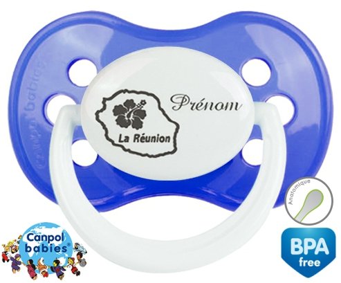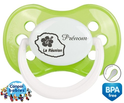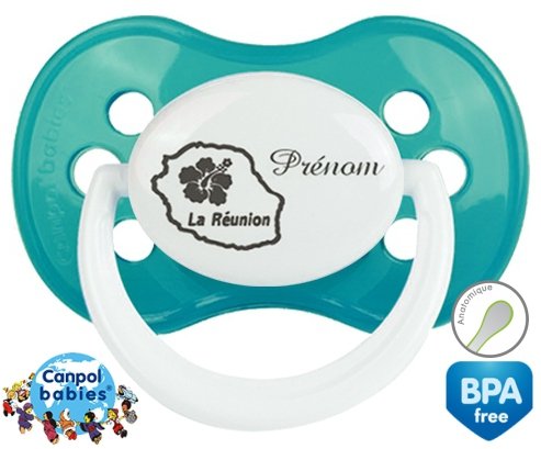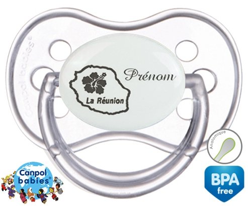 Tetine personnalisee pour bébé Ile de la réunion + prénom à embout Anatomique en silicone de la marque Canpol Babies avec impression en en Gris de la collection Prénom personnalisé.La silicone se reconnaît par sa couleur transparente. C'est une matière souple, douce, sans goût ni odeur et offre à bébé une succion plus facile grâce à sa souplesse.
