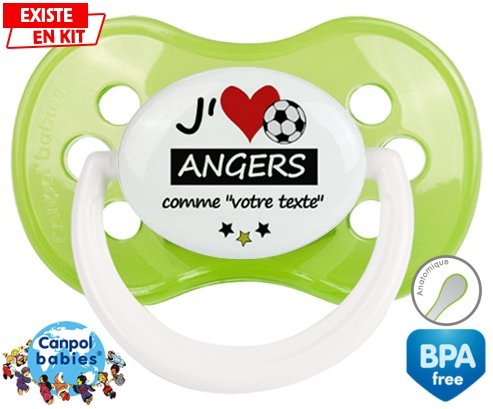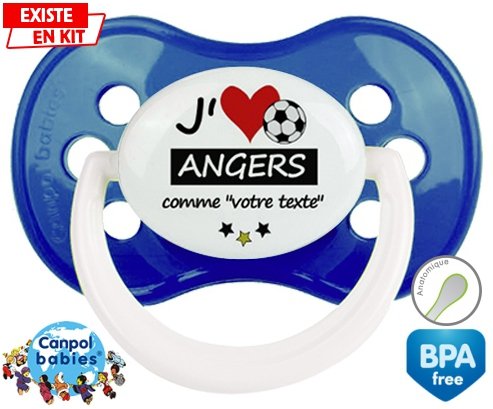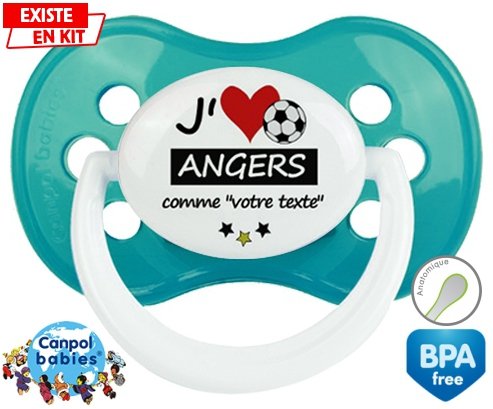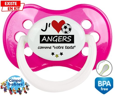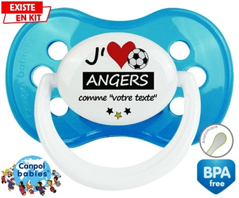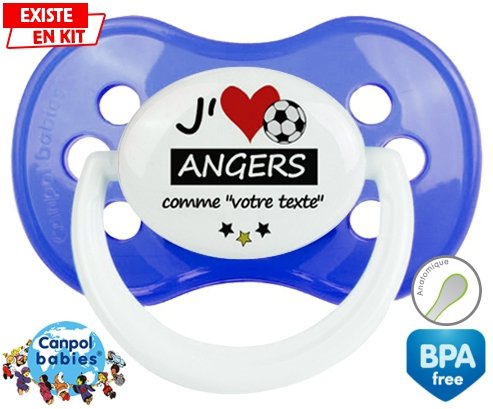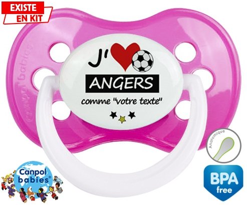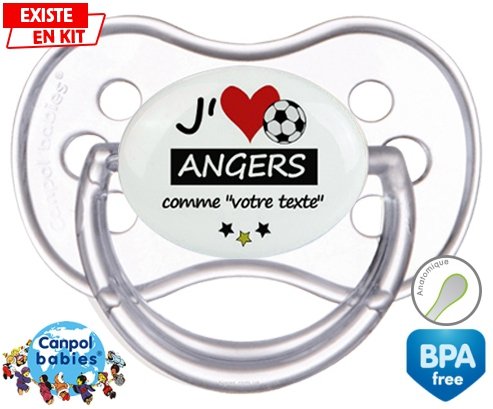 Sucette personnalisée pour bébé J'aime angers + prénom à embout Anatomique en silicone de la marque Canpol Babies avec impression en en Couleurs de la collection Prénom personnalisé.La silicone se reconnaît par sa couleur transparente. C'est une matière souple, douce, sans goût ni odeur et offre à bébé une succion plus facile grâce à sa souplesse.
