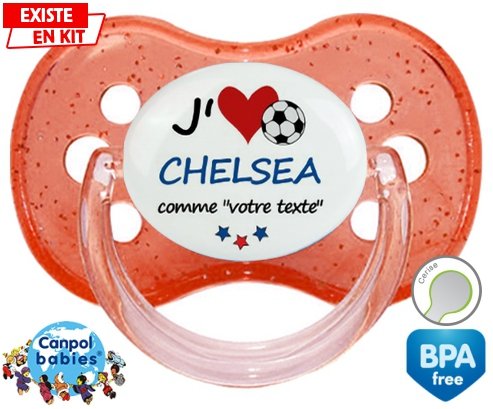 Sucette personnalisée pour bébé J'aime chelsea + prénom à embout Cerise en silicone de la marque Canpol Babies avec impression en en Couleurs de la collection Prénom personnalisé.La silicone se reconnaît par sa couleur transparente. C'est une matière souple, douce, sans goût ni odeur et offre à bébé une succion plus facile grâce à sa souplesse.