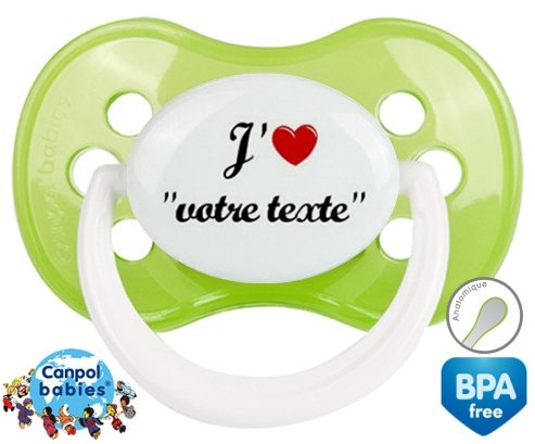 Sucette personnalisée avec le prénom pour bébé J'aime cœur + prénom : Sucette Anatomique en silicone de la marque Canpol Babies avec impression en couleur.