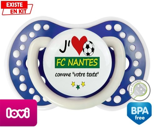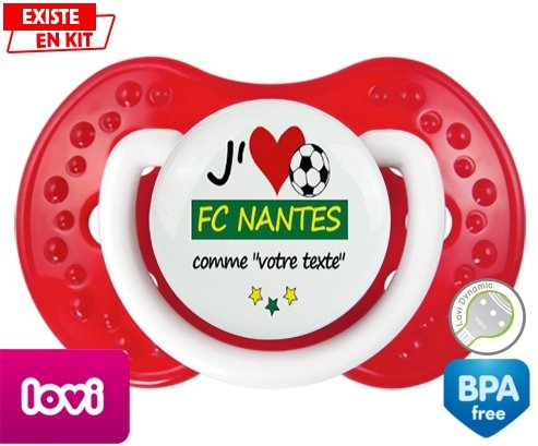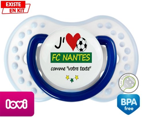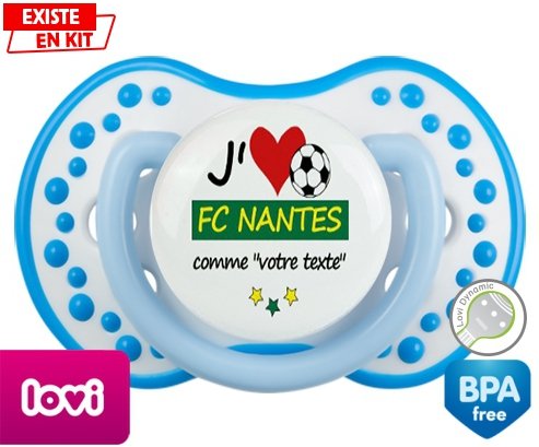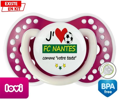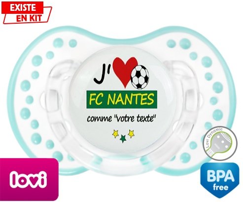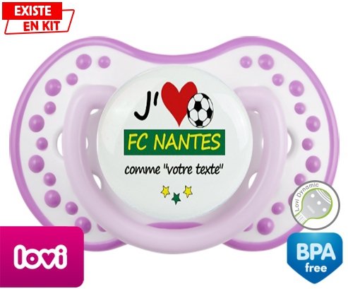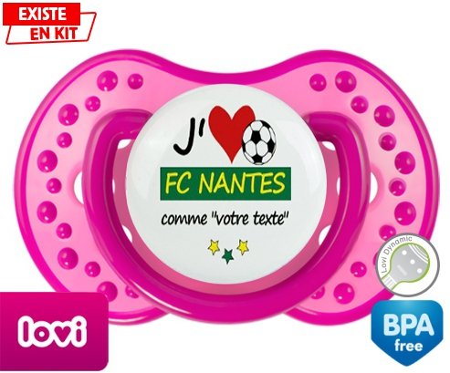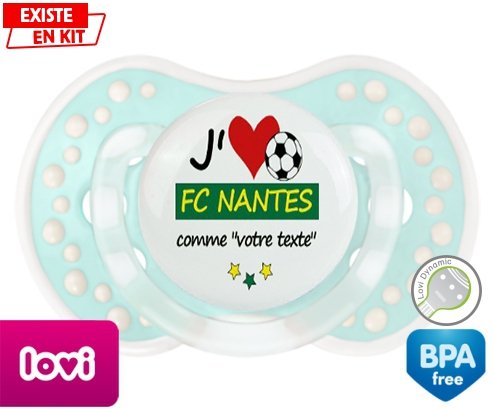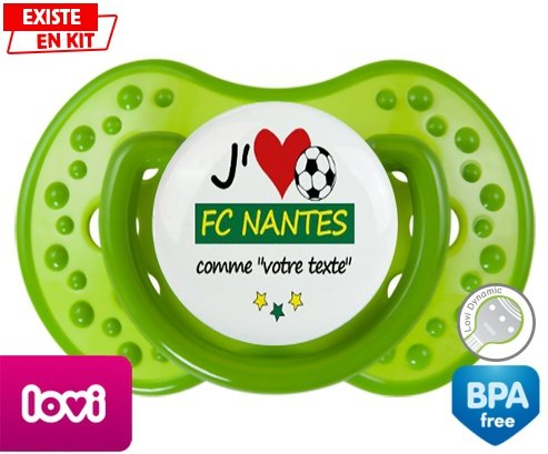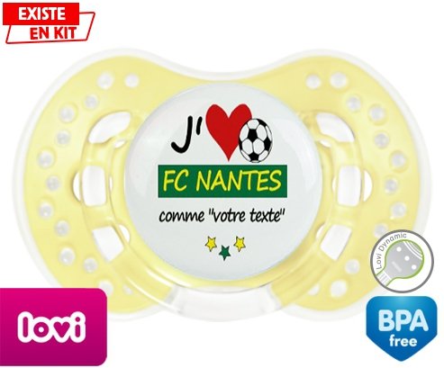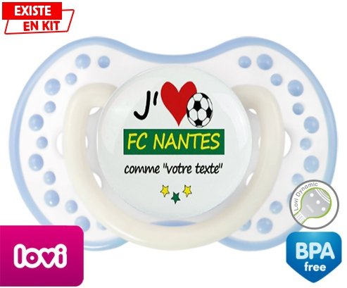 Sucette personnalisée avec le prénom pour bébé J'aime fc nantes + prénom : Sucette LOVI Dynamic en silicone de la marque Lovi Dynamic avec impression en couleur.