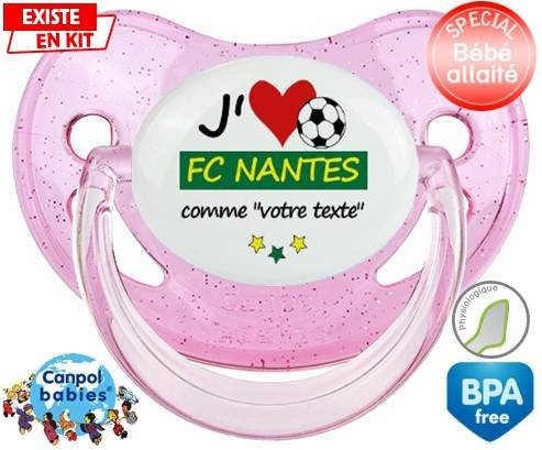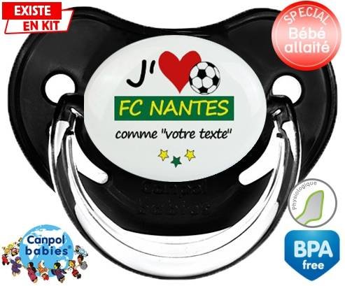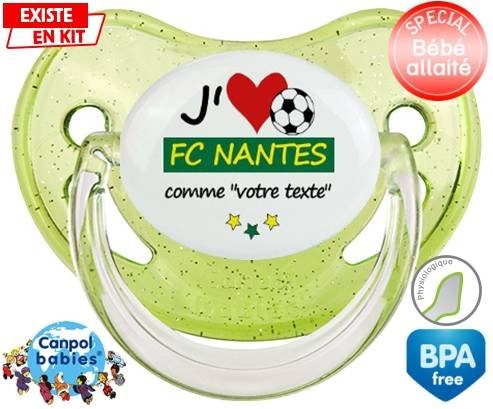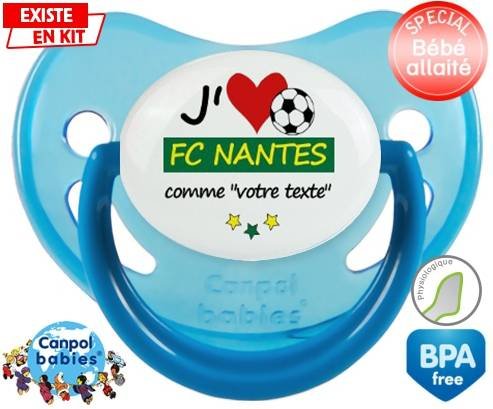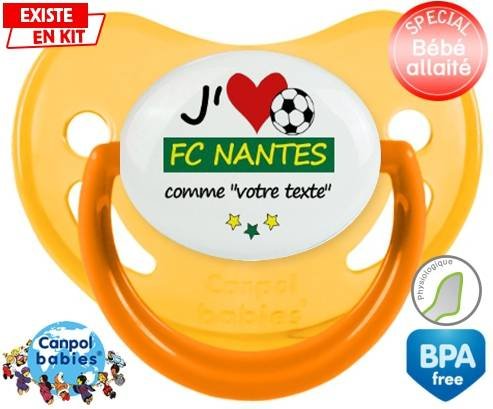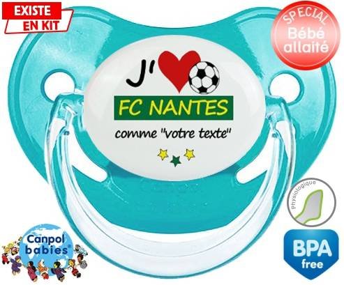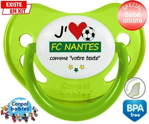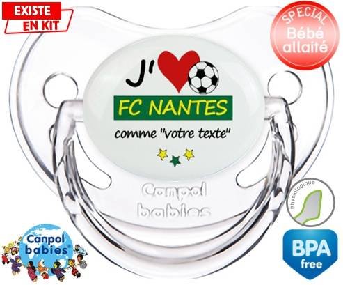 Sucette personnalisée avec le prénom pour bébé J'aime fc nantes + prénom : Sucette Physiologique en silicone de la marque Canpol Babies avec impression en couleur.