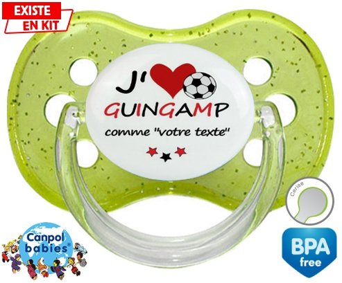 Tétine personnalisée pour bébé J'aime guingamp + prénom à embout Cerise en silicone de la marque Canpol Babies avec impression en en Couleurs de la collection Prénom personnalisé.La silicone se reconnaît par sa couleur transparente. C'est une matière souple, douce, sans goût ni odeur et offre à bébé une succion plus facile grâce à sa souplesse.