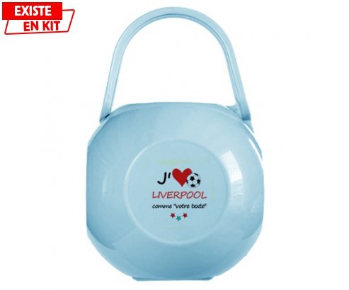 Boîte à sucette personnalisée : J'aime liverpool + prénom , avec une impression en couleur et qui compléte toute la gamme ( sucette, attache-sucette, bavoir, chausson, body et bonnet).