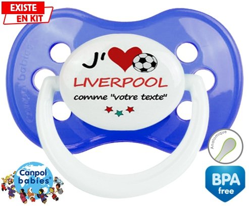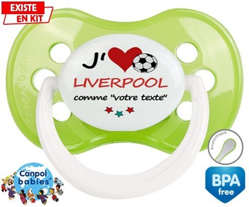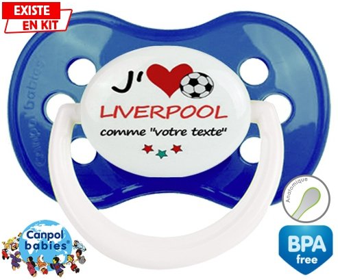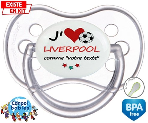 Sucette personnalisée pour bébé J'aime liverpool + prénom à embout Anatomique en silicone de la marque Canpol Babies avec impression en en Couleurs de la collection Prénom personnalisé.La silicone se reconnaît par sa couleur transparente. C'est une matière souple, douce, sans goût ni odeur et offre à bébé une succion plus facile grâce à sa souplesse.