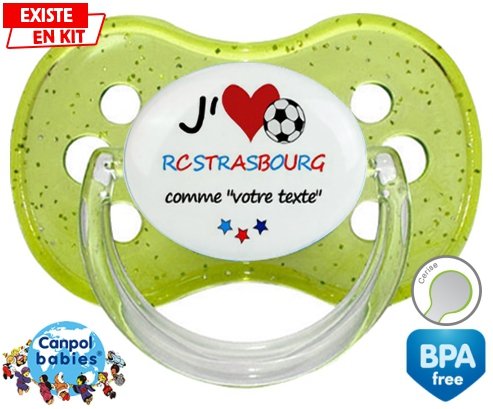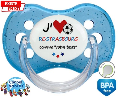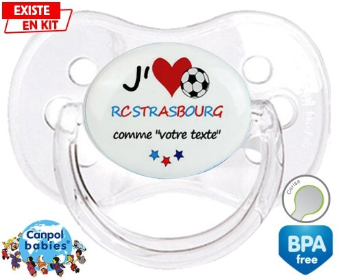 Tétine personnalisée pour bébé J'aime rc strasbourg + prénom à embout Cerise en silicone de la marque Canpol Babies avec impression en en Couleurs de la collection Prénom personnalisé.La silicone se reconnaît par sa couleur transparente. C'est une matière souple, douce, sans goût ni odeur et offre à bébé une succion plus facile grâce à sa souplesse.