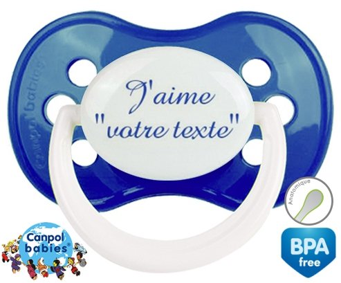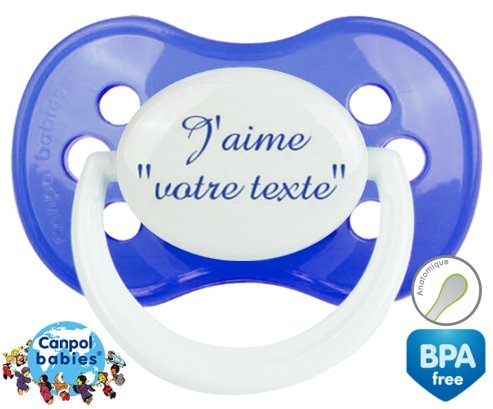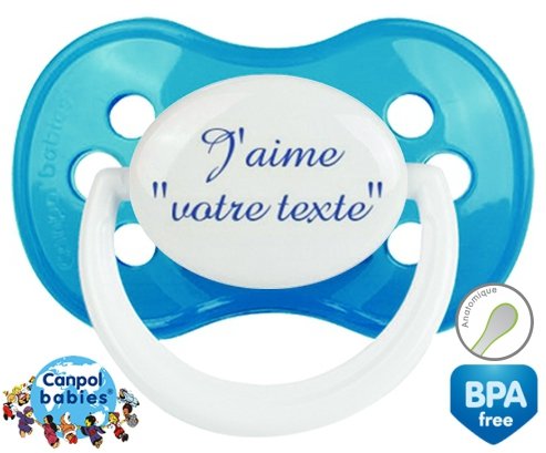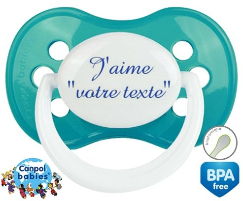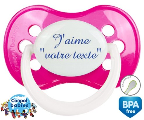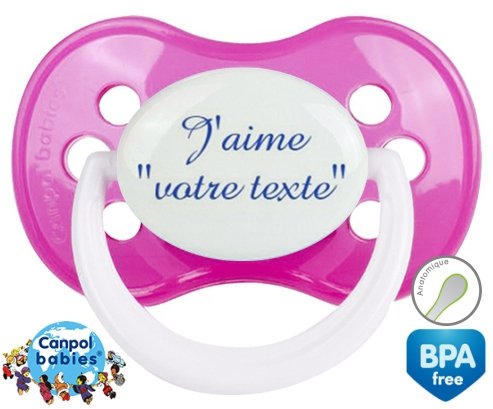 Sucette personnalisée avec le prénom pour bébé J'aime style3 + prénom : Sucette Anatomique en silicone de la marque Canpol Babies avec impression en couleur.