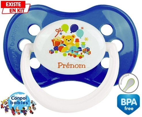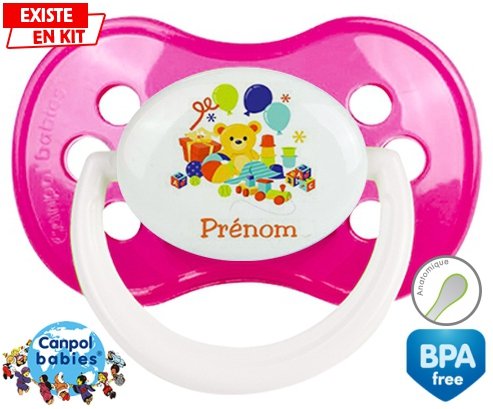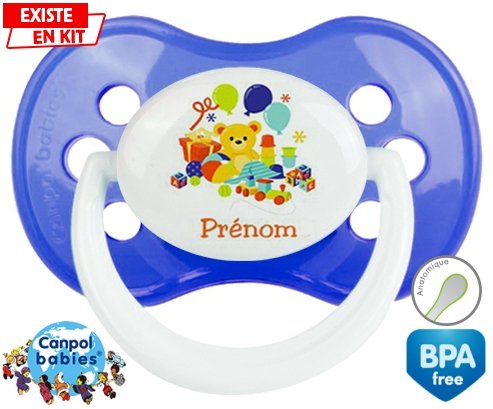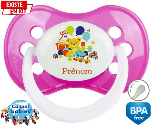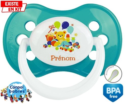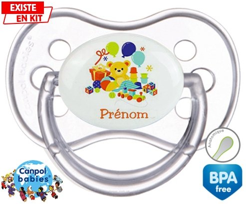 Sucette personnalisée pour bébé Jouets style1 + prénom à embout Anatomique en silicone de la marque Canpol Babies avec impression en en Couleurs de la collection Prénom personnalisé.La silicone se reconnaît par sa couleur transparente. C'est une matière souple, douce, sans goût ni odeur et offre à bébé une succion plus facile grâce à sa souplesse.