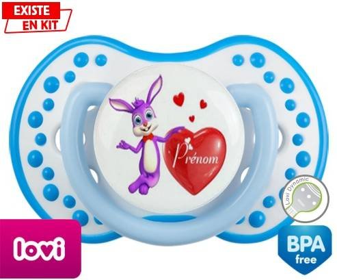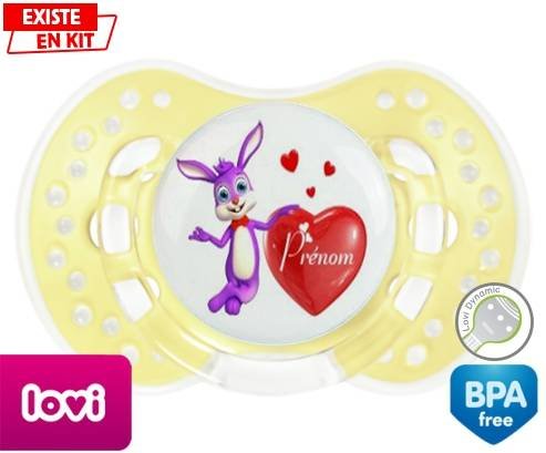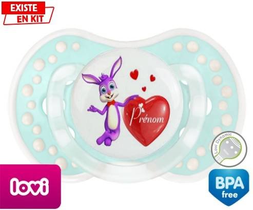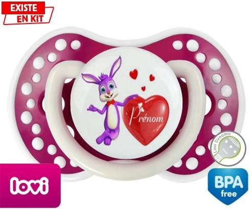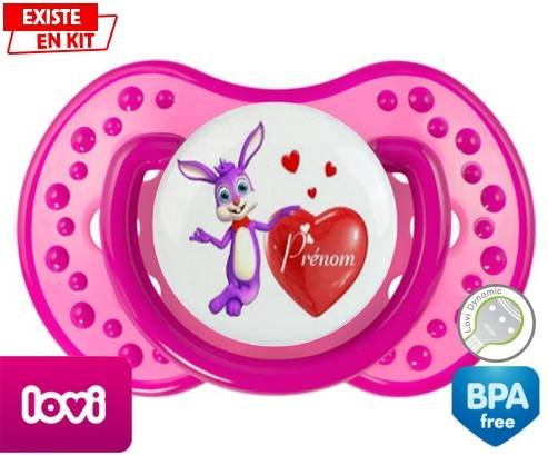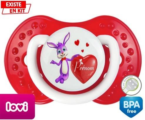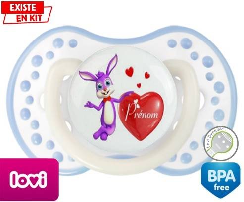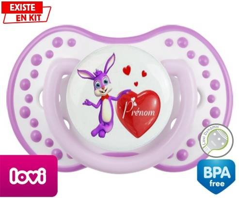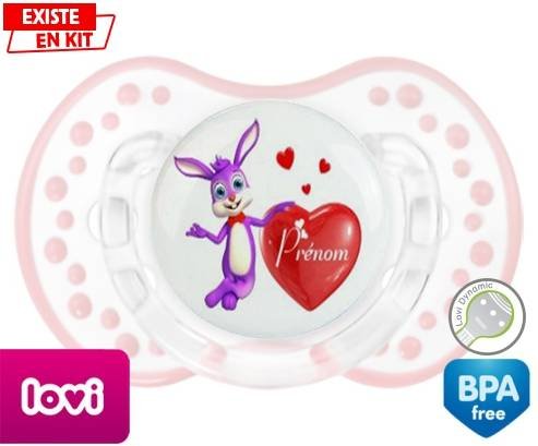 Sucette personnalisée pour bébé Lapin cœur + prénom à embout LOVI Dynamic en silicone de la marque Lovi Dynamic avec impression en en Couleurs de la collection Prénom personnalisé.La silicone se reconnaît par sa couleur transparente. C'est une matière souple, douce, sans goût ni odeur et offre à bébé une succion plus facile grâce à sa souplesse.