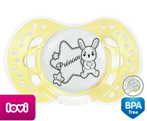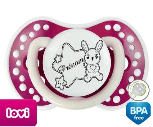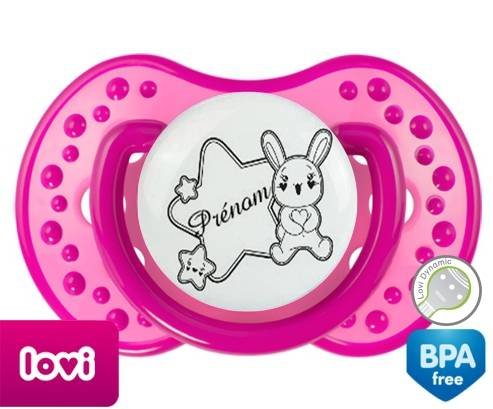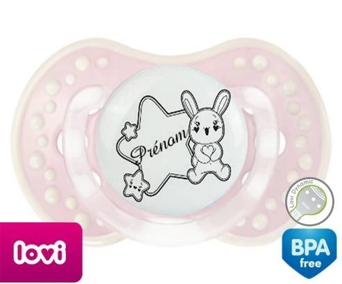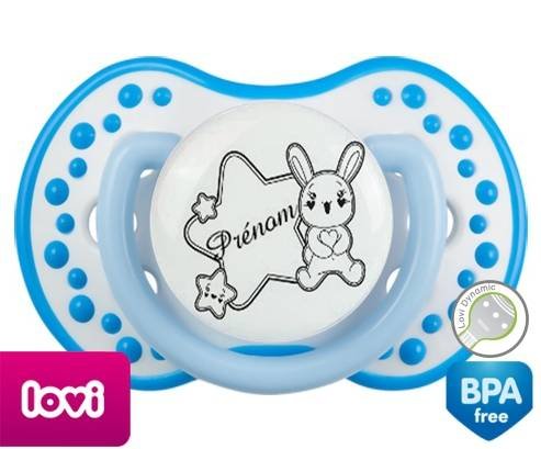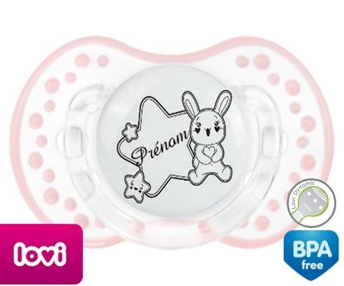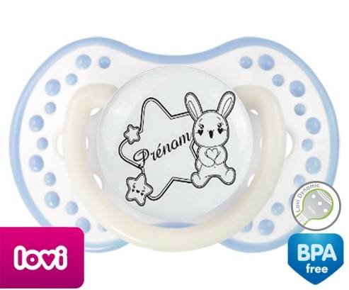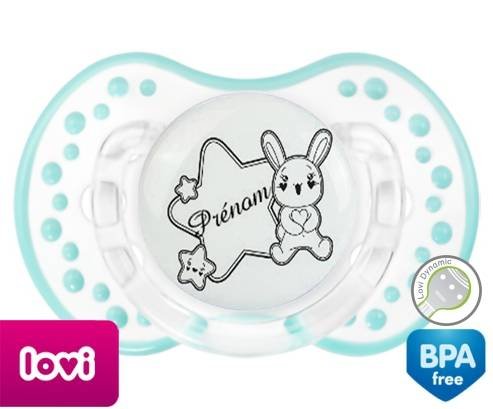 Tétine personnalisée pour bébé Lapin étoile + prénom à embout LOVI Dynamic en silicone de la marque Lovi Dynamic avec impression en en Gris de la collection Prénom personnalisé.La silicone se reconnaît par sa couleur transparente. C'est une matière souple, douce, sans goût ni odeur et offre à bébé une succion plus facile grâce à sa souplesse.