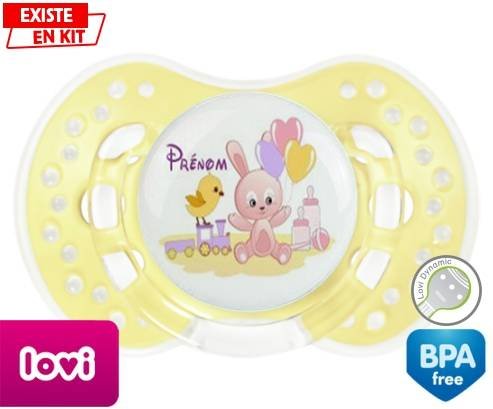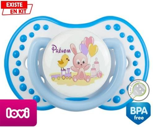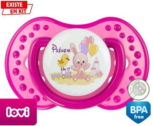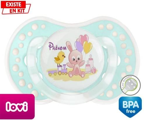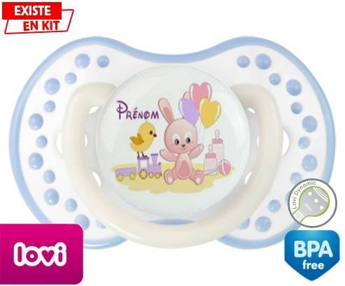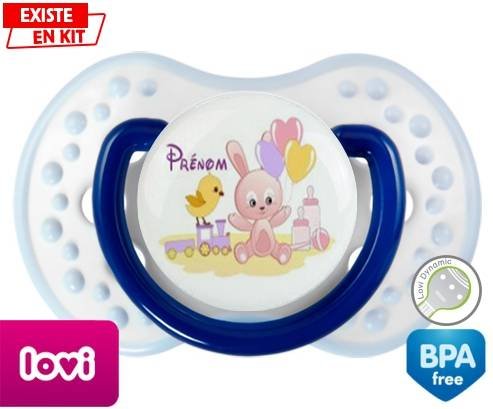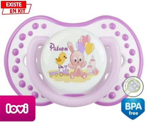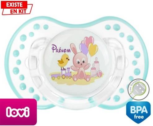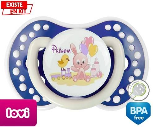 Sucette personnalisée pour bébé Lapin train + prénom à embout LOVI Dynamic en silicone de la marque Lovi Dynamic avec impression en en Couleurs de la collection Prénom personnalisé.La silicone se reconnaît par sa couleur transparente. C'est une matière souple, douce, sans goût ni odeur et offre à bébé une succion plus facile grâce à sa souplesse.