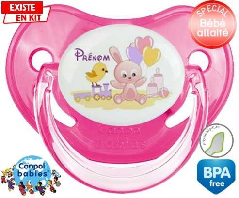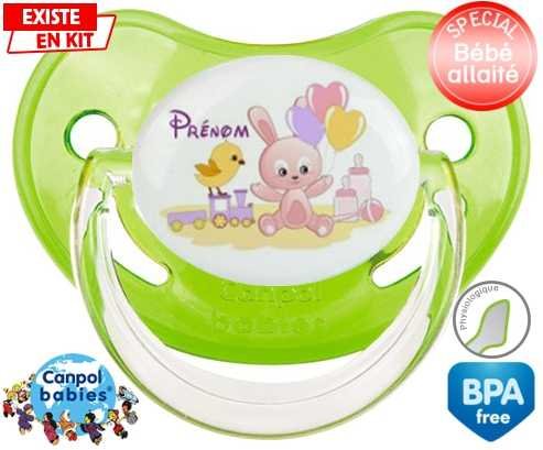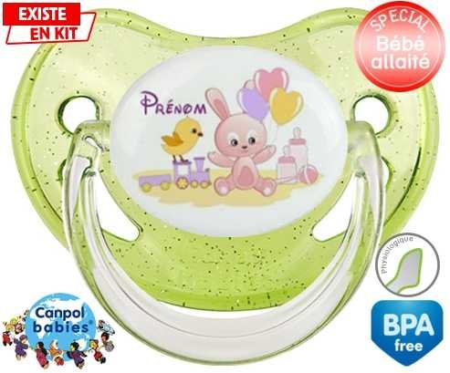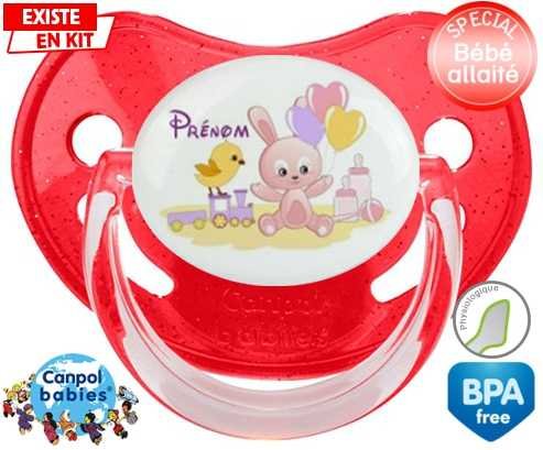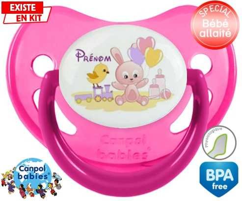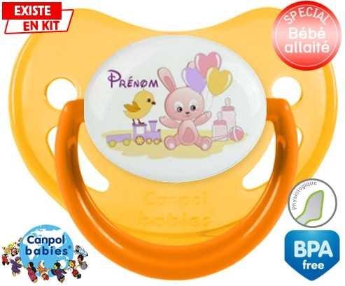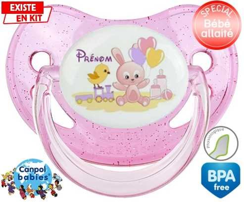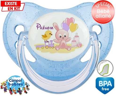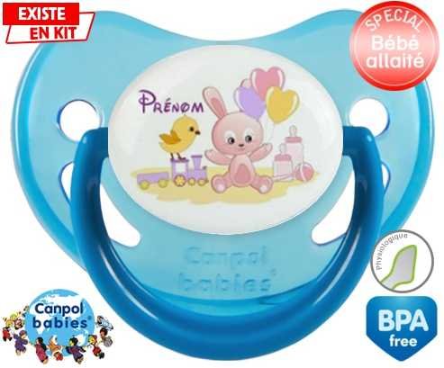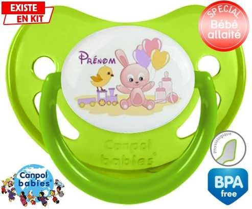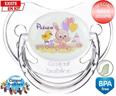 Sucette personnalisée pour bébé Lapin train + prénom à embout Physiologique en silicone de la marque Canpol Babies avec impression en en Couleurs de la collection Prénom personnalisé.La silicone se reconnaît par sa couleur transparente. C'est une matière souple, douce, sans goût ni odeur et offre à bébé une succion plus facile grâce à sa souplesse.