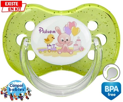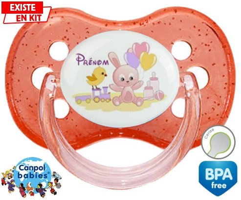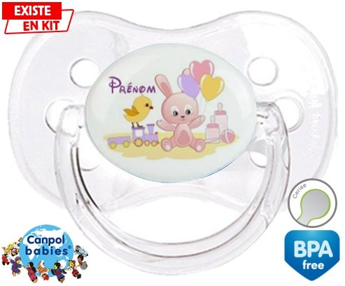 Tétine personnalisée pour bébé Lapin train + prénom à embout Cerise en silicone de la marque Canpol Babies avec impression en en Couleurs de la collection Prénom personnalisé.La silicone se reconnaît par sa couleur transparente. C'est une matière souple, douce, sans goût ni odeur et offre à bébé une succion plus facile grâce à sa souplesse.