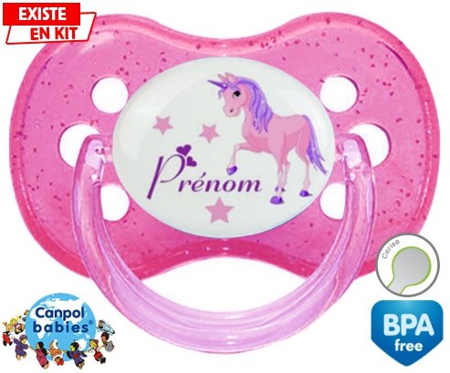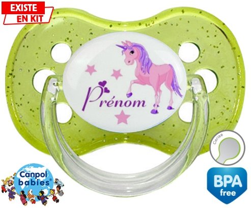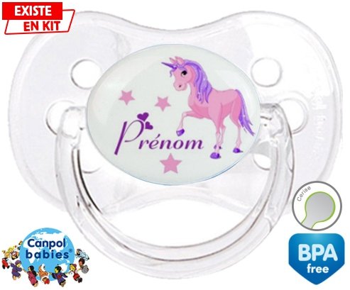 Sucette personnalisée pour bébé Licorne style1 + prénom à embout Cerise en silicone de la marque Canpol Babies avec impression en en Couleurs de la collection Prénom personnalisé.La silicone se reconnaît par sa couleur transparente. C'est une matière souple, douce, sans goût ni odeur et offre à bébé une succion plus facile grâce à sa souplesse.