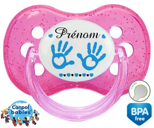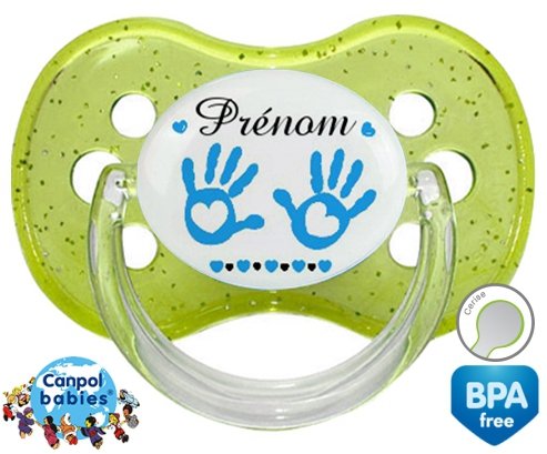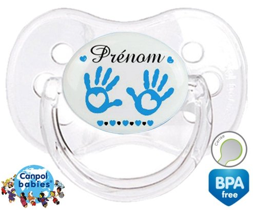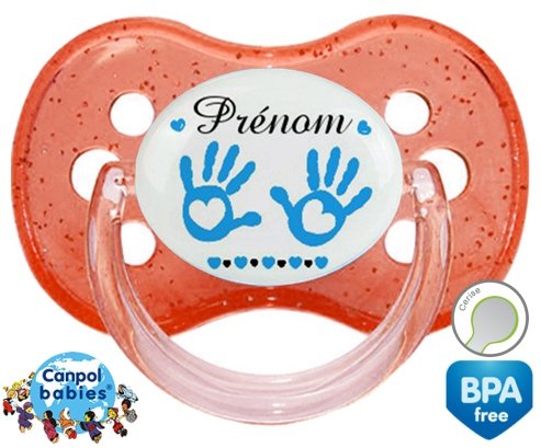 Tetine personnalisee pour bébé Main de bébé (garçon) + prénom à embout Cerise en silicone de la marque Canpol Babies avec impression en en Couleurs de la collection Prénom personnalisé.La silicone se reconnaît par sa couleur transparente. C'est une matière souple, douce, sans goût ni odeur et offre à bébé une succion plus facile grâce à sa souplesse.