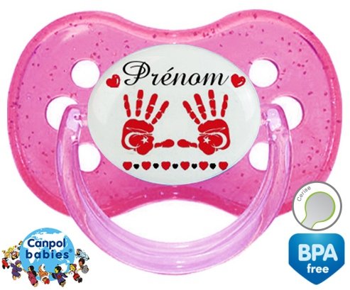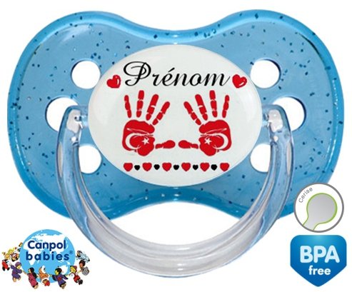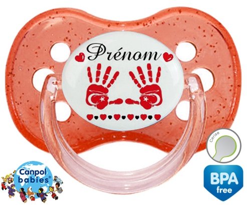 Tetine personnalisee pour bébé Main de bébé turquie + prénom à embout Cerise en silicone de la marque Canpol Babies avec impression en en Couleurs de la collection Prénom personnalisé.La silicone se reconnaît par sa couleur transparente. C'est une matière souple, douce, sans goût ni odeur et offre à bébé une succion plus facile grâce à sa souplesse.