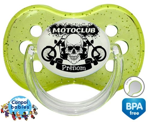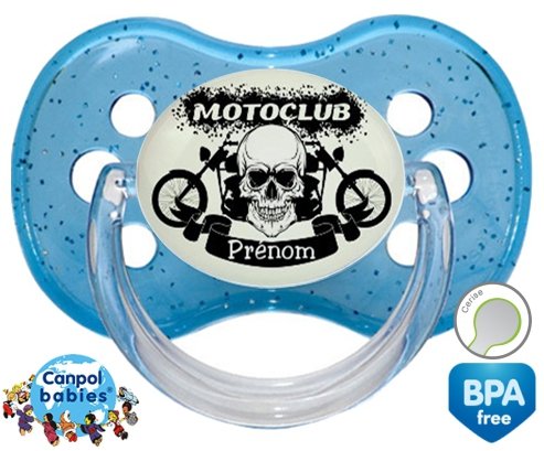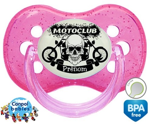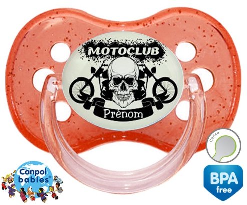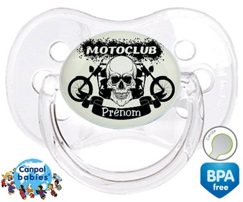 Tetine personnalisee pour bébé Motard + prénom à embout Cerise en silicone de la marque Canpol Babies avec impression en en Couleurs de la collection Prénom personnalisé.La silicone se reconnaît par sa couleur transparente. C'est une matière souple, douce, sans goût ni odeur et offre à bébé une succion plus facile grâce à sa souplesse.