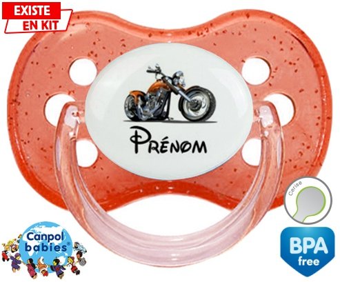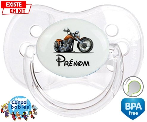 Tétine personnalisée pour bébé Moto et style2 + prénom à embout Cerise en silicone de la marque Canpol Babies avec impression en en Couleurs de la collection Prénom personnalisé.La silicone se reconnaît par sa couleur transparente. C'est une matière souple, douce, sans goût ni odeur et offre à bébé une succion plus facile grâce à sa souplesse.