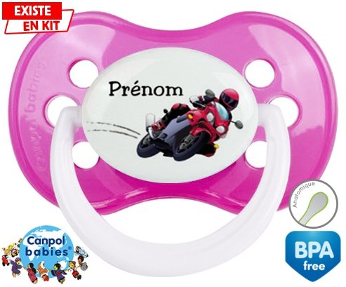 Tetine personnalisee pour bébé Moto style2 + prénom à embout Anatomique en silicone de la marque Canpol Babies avec impression en en Couleurs de la collection Prénom personnalisé.La silicone se reconnaît par sa couleur transparente. C'est une matière souple, douce, sans goût ni odeur et offre à bébé une succion plus facile grâce à sa souplesse.