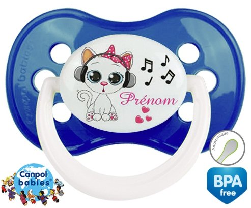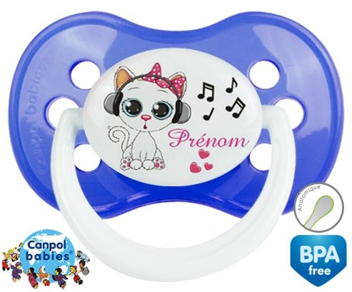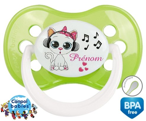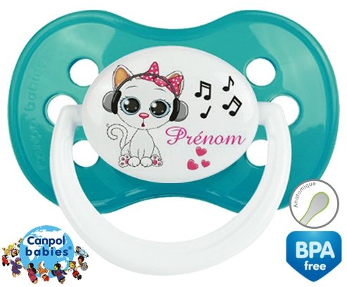 Sucette personnalisée pour bébé Musique et chat + prénom à embout Anatomique en silicone de la marque Canpol Babies avec impression en en Couleurs de la collection Prénom personnalisé.La silicone se reconnaît par sa couleur transparente. C'est une matière souple, douce, sans goût ni odeur et offre à bébé une succion plus facile grâce à sa souplesse.