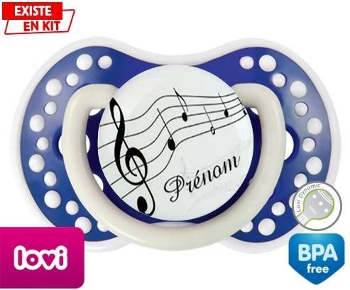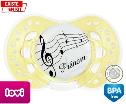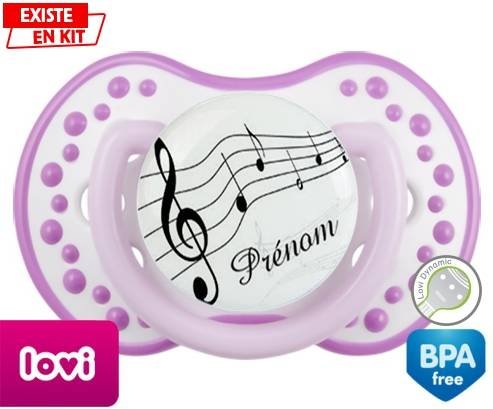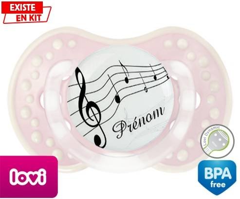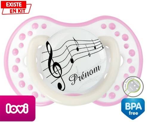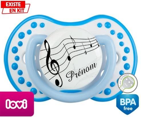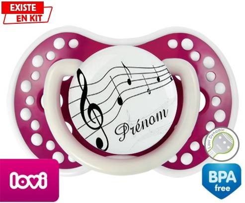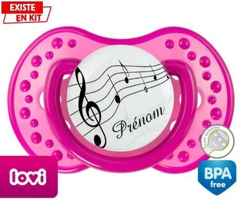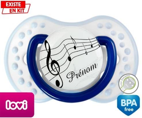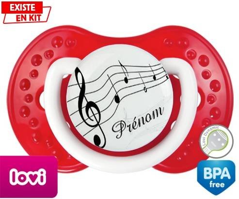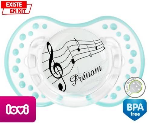 Sucette personnalisée pour bébé Musique + prénom à embout LOVI Dynamic en silicone de la marque Lovi Dynamic avec impression en en Couleurs de la collection Prénom personnalisé.La silicone se reconnaît par sa couleur transparente. C'est une matière souple, douce, sans goût ni odeur et offre à bébé une succion plus facile grâce à sa souplesse.