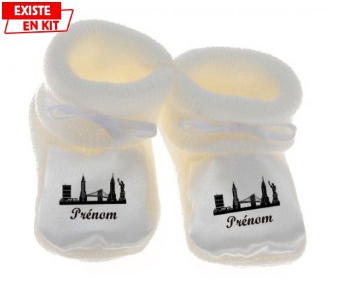 Su7.fr vous propose le chausson bébé personnalisé pour nouveau né avec le design : New york + prénom . Ce chausson avec une impression en couleur compléte toute la gamme ( sucette, attache-sucette, bavoir, chausson, body , Boîte à sucette, et bonnet).